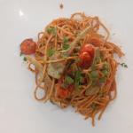 Pasta al pesto rojo con alcachofas tomates cherry y alcaparras