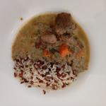 Pavo a la cerveza con guarnición de arroces integrales y verduras