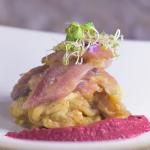 Ternera estofada con cacao y oporto con puré de patata y manzana