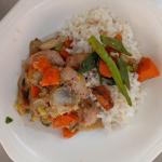 Albóndigas de pollo en salsa con arroz y verduras