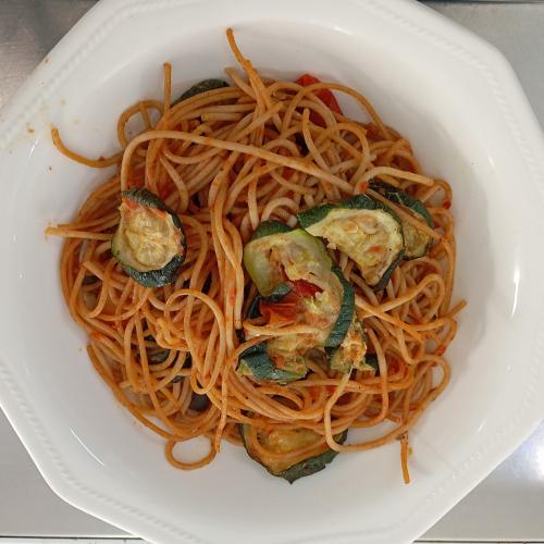 Pasta integral con calabacín aceitunas tomate cherry y menta